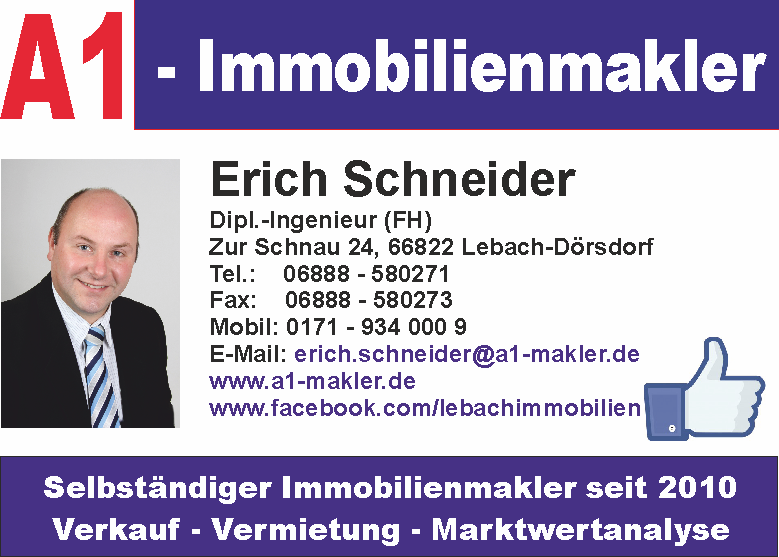 Ihr Makler in Lebach und Umgebung Zur Schnau 24 66822 Lebach Home-Office: 06888-580271 E-Mail: erich.schneider@a1-makler.de